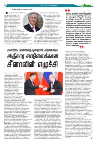 ஐந்தாவது, சீனாவின் அணுகுமுறையில் ரஷ்யா மிகப்பிரதான பங்கை வகிக்கும் நாடாக விளங்குகின்றது. அதாவது சீனாவின் பொருளாதார பாய்ச்சலையும், ரஷ்யாவின் இராணுவ அணுகுமுறைக்கான நடவடிக்கைகளையும் அதுவும் குறிப்பாக அமெரிக்காவிற்கு எதிரான நடவடிக்கைகளை ரஷ்யா மேற்கொள்வதையும் அவதானிக்கமுடிகின்றது. அமெரிக்க பொருளாதாரத்தை சிதைப்பதில் சீனா எடுக்கும் கரிசனையை போன்று அமெரிக்காவின் இராணுவ நகர்வுகளை ரஷ்யா நெருக்கடிக்குள்ளாக்கி வருகின்றது. எனவே இத்தகைய போட்டித்தன்மையில் ஈடுபடும் ரஷ்யாவும் சீனாவும் யுத்தத்தை எதிர்க்கொள்வது என்பதுஅமெரிக்காவின் விருப்பமாக இருக்கலாமேயன்ற போதும் அது சீனாவின் நோக்கமாக இருக்க வாய்ப்பில்லை என்றே கூறலாம். ஆனாலும் சீன, ரஷ்யாவிற்கிடையில் மோதலை விட மேற்குக்கு எதிரான இணைவாகவே அதனை புரிந்துக்கொள்ளுதல் வேண்டும்.