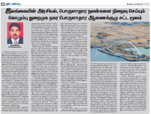 கொழும்பு துறைமுக நகர பொருளாதார ஆணைக்கழுவின் சட்ட மூலம் உயர் நீதிமன்றத்தால் திருத்தத்திற்கு முன்மொழியப்பட்டுள்ளது. இலங்கை அரசியலில் பெரும் சர்ச்சையைக் கிளப்பிய கொழும்பு துறைமுக நகரத் திட்டம் மீளவும் நடைமுறைப் படுத்தலுக்கான வாய்ப்பினை ஏற்படுத்தியிருப்பதோடு இலங்கையின் முதலீட்டு சபை கொழும்பு துறைமுக நகரத்தின் முதலீடுகளை ஆரம்பிக்க தயாராக இருப்பதாகவும் தகவல்கள் உறுதிப்படுத்துகின்றன. இக் கட்டுரையும் கொழும்பு துறைமுக நகரம் தொடர்பான சட்ட மூலம் பற்றிய அரசாங்கம் எடுத்திருக்கும் நடவடிக்கையின் அரசியலை விளங்கிக் கொள்வதாக அமைய உள்ளது.