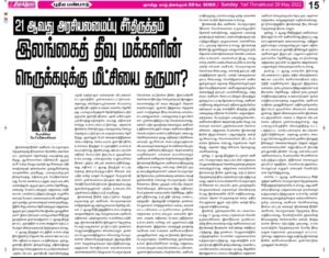 இலங்கைத் தீவின் அரசியல் பொருளாதார நெருக்கடிக்கு தீர்வுகளை நோக்கிய அரசாங்க மட்ட நகர்வுகள் தெளிவற்ற வடிவத்தை தருகிறது. ஆட்சியாளர்கள் எதிர்கட்சி ஆளும் கட்சி என்ற வேறுபாடின்றி ஆட்சியையும் அதிகாரத்தையும் தக்க வைக்க முயலுகின்றதை அவதானிக்க முடிகிறது. பாராளுமன்றநமும் நிறைவேற்று அதிகாரமும் மோதிக் கொள்ளவது போல் காணப்பட்டாலும் அடிப்படையில் அனைத்துமே ஆளும் தரப்பாகவே தெரிகிறது. மக்களது போராட்டங்களும் அத்தகைய சக்திகளால் பலவீனப்படுத்தப்படுவதும் எழுச்சிகளையும் போராட்டங்களையும் கட்சி அரசியலுக்குள் நகர்த்த முயல்வதையும் காணமுடிகிறது. இதில் சிறுபான்மைத் தேசியங்களும் அத்தகைய ஆளும் தரப்புக்குள்ளேயே இயங்க முயலுகின்றனர். இக்கட்டுரையும் பாராளுமன்றம் சீர்திருத்துவதற்காக முன்வைத்துள்ள 21 வது திருத்தச்சட்ட மூலத்தின் உள்ளடக்கத்தால் ஏற்படப் போகும் விளைவுகளைத் தேடுவதாக உள்ளது.